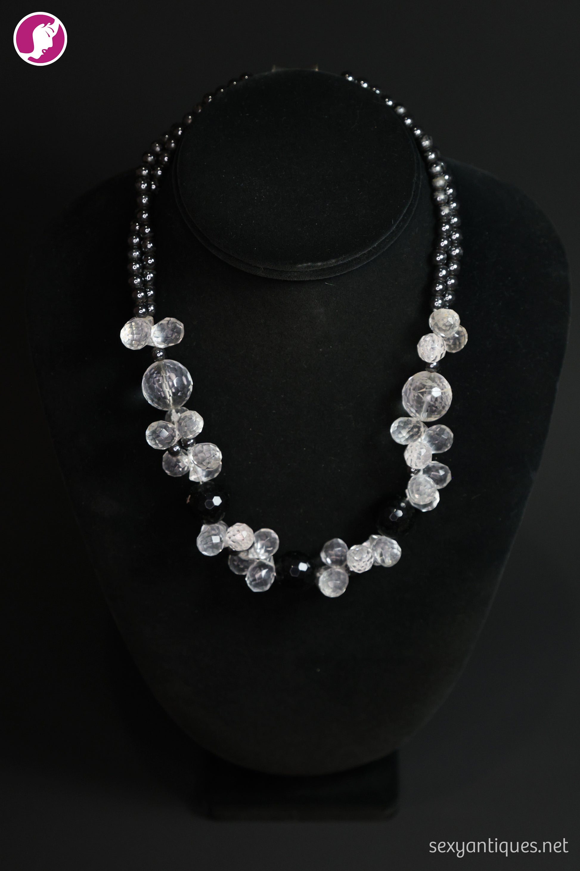 Elegance never goes out of style. This authentic lucite bead necklace from the 1930s captures the glamour of a bygone era. Crafted from richly faceted clear and black lucite beads, it catches light with every movement. The floral cluster design offers bold femininity with vintage grace.