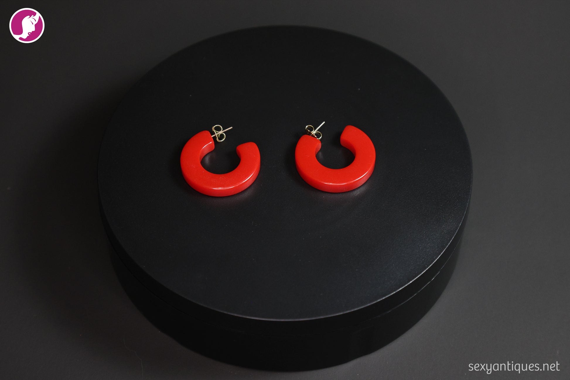 These authentic 1940s vintage red Bakelite hoop earrings are a striking piece of mid-century style. Their smooth, polished surface and rich, deep red color capture the warmth and craftsmanship of the era. Lightweight yet bold, they bring a touch of timeless glamour to any look.